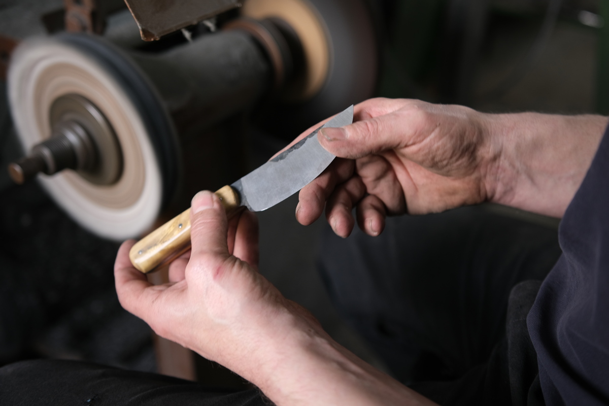 Nous travaillons les finitions initiales de la lame, préparant minutieusement le tranchant pour une efficacité optimale.